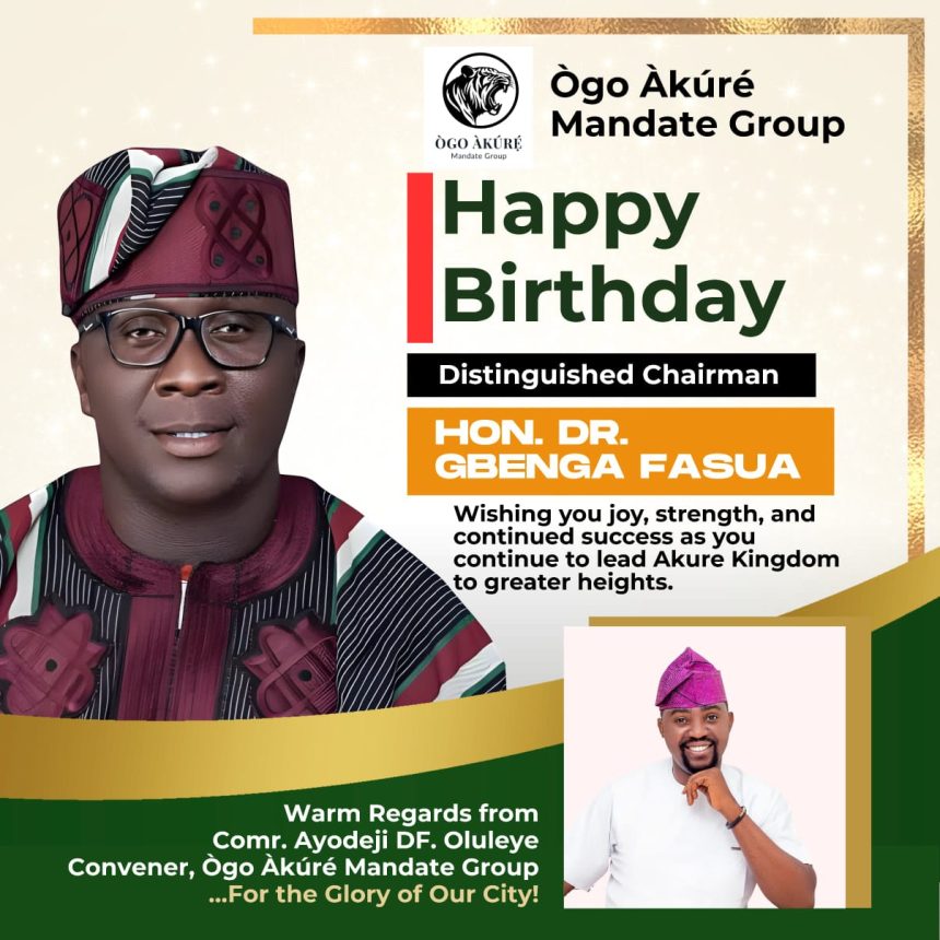 The Convener of Ògo Àkúré Mandate Group, Comr. Ayodeji DF. Oluleye, on behalf of the entire members of the group, heartily felicitates with the distinguished Chairman of Akure South Local Government, Hon. Dr. Gbenga Fasua, on the occasion of his birthday.