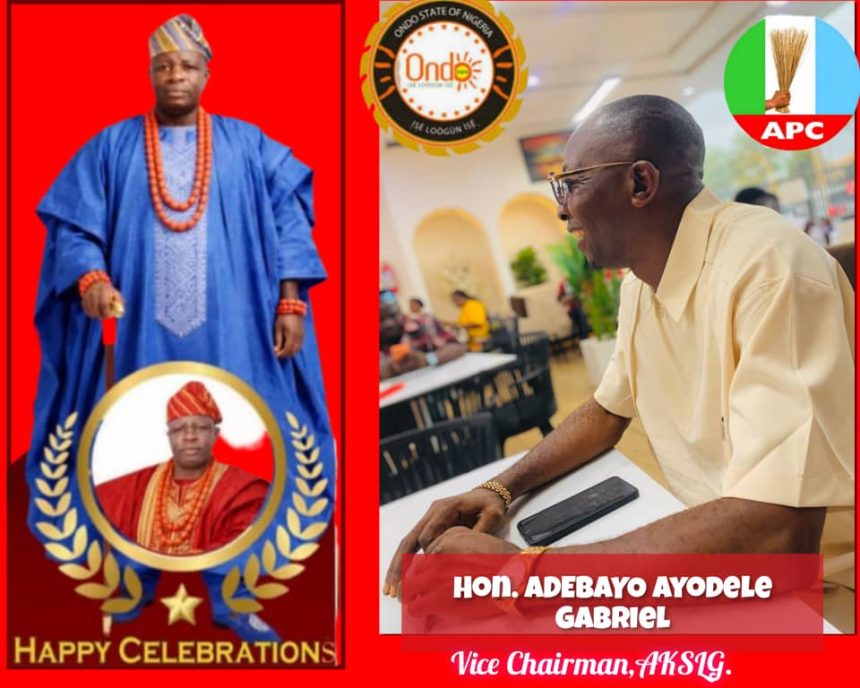 Hon. ADEBAYO, Ayodele Gabriel, Vice Chairman AKSLG heartily congratulate HIGH CHIEF ADESINA ADELUSI FAYEHUN on his well-deserved installation as the High Chief Edemo of Akure Kingdom by His Imperial Majesty, the Deji of Akure Kingdom.